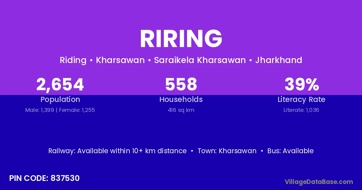 Riring village has a total population of 2,654 people, of which 1,399 are males and 1,255 are females.