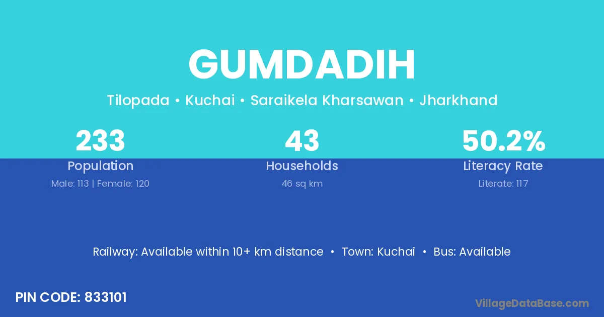 Gumdadih village has a total population of 233 people, of which 113 are males and 120 are females.