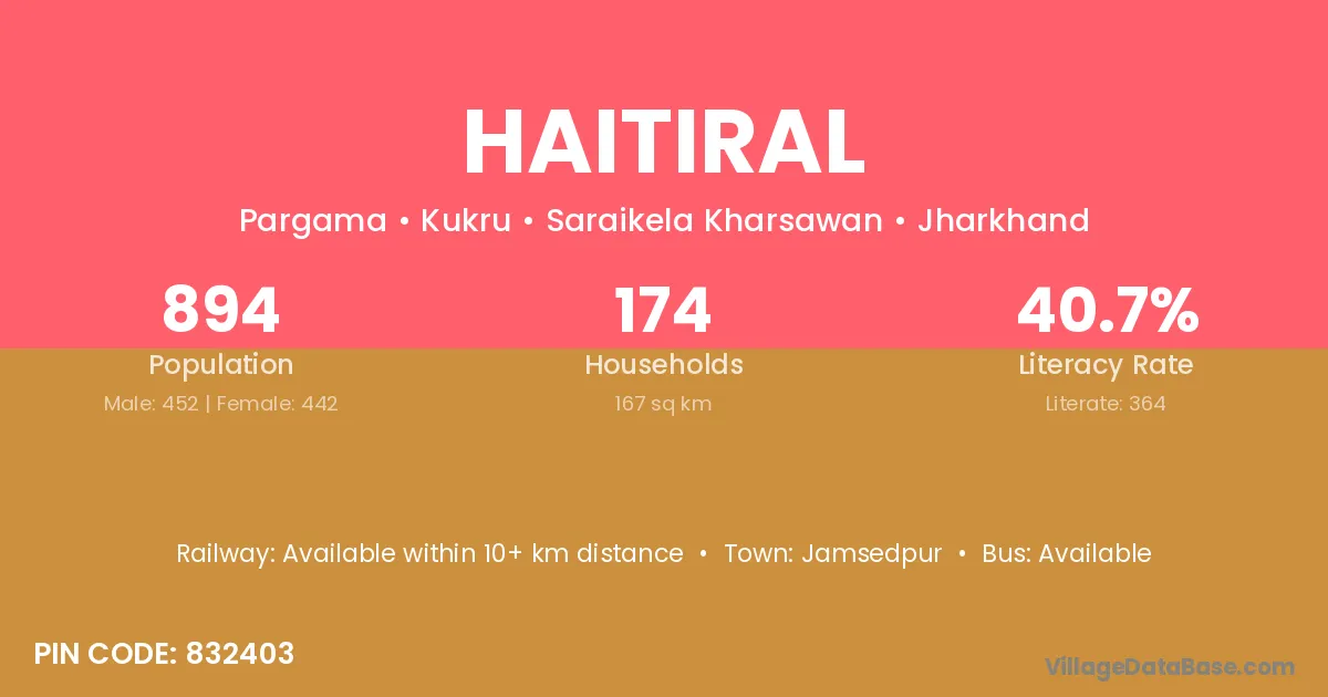 Haitiral village has a total population of 894 people, of which 452 are males and 442 are females.