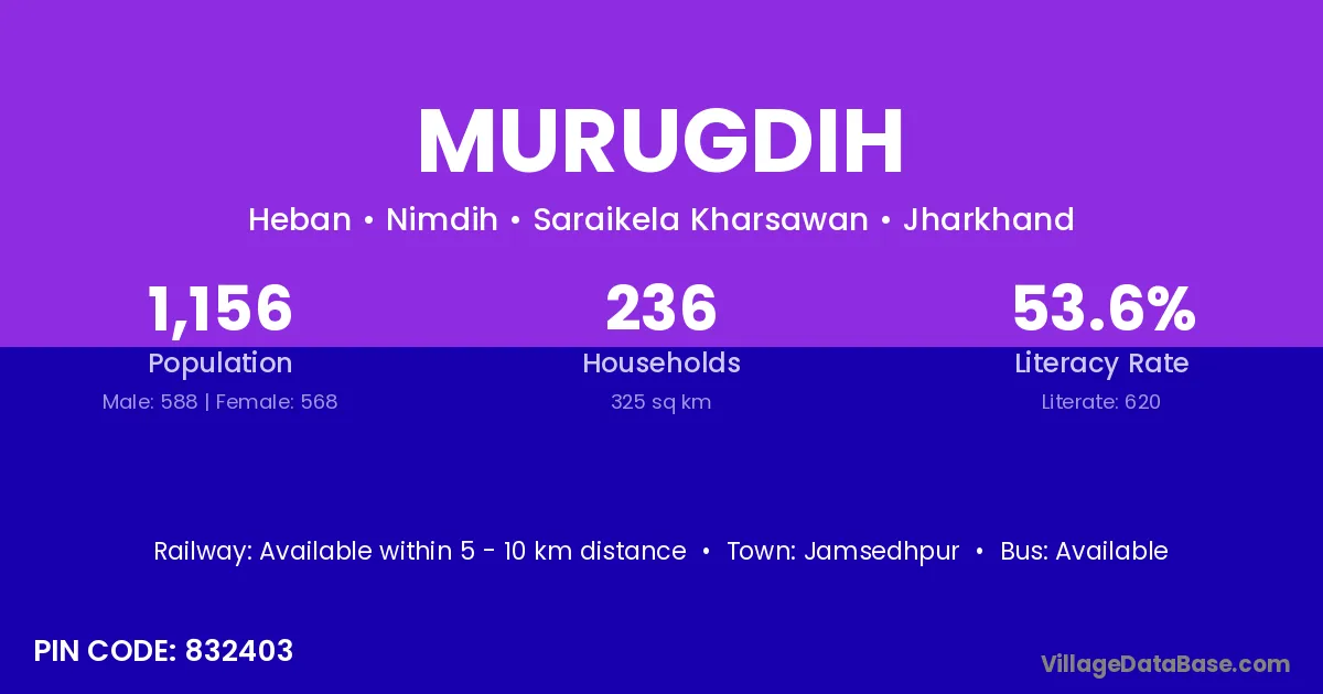 Murugdih village has a total population of 1,156 people, of which 588 are males and 568 are females.