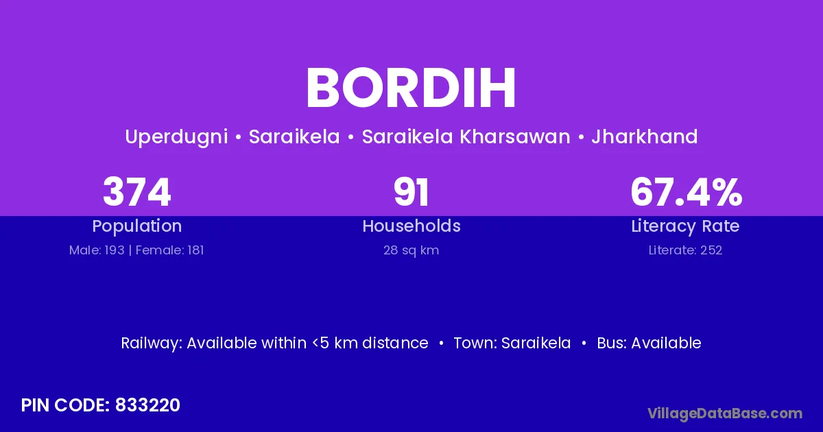 According to Census 2011 information, the village code of Bordih village is 833220.