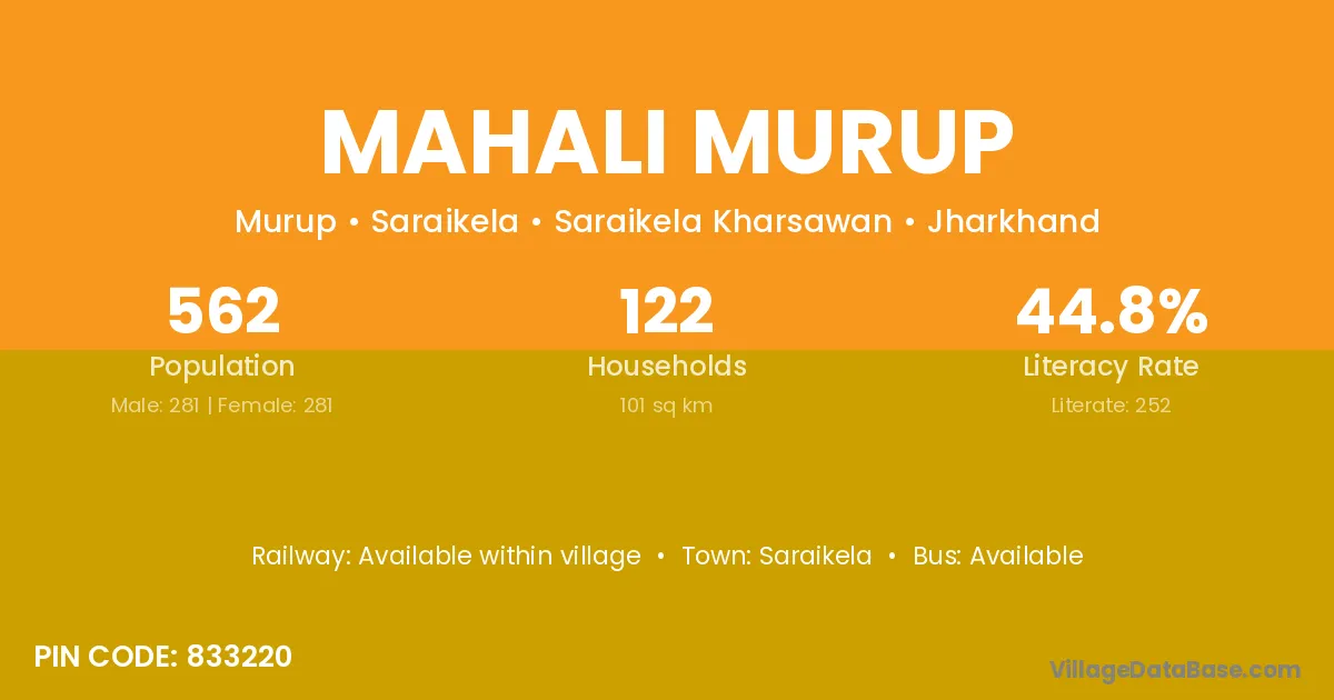 Mahali Murup village has a total population of 562 people, of which 281 are males and 281 are females.