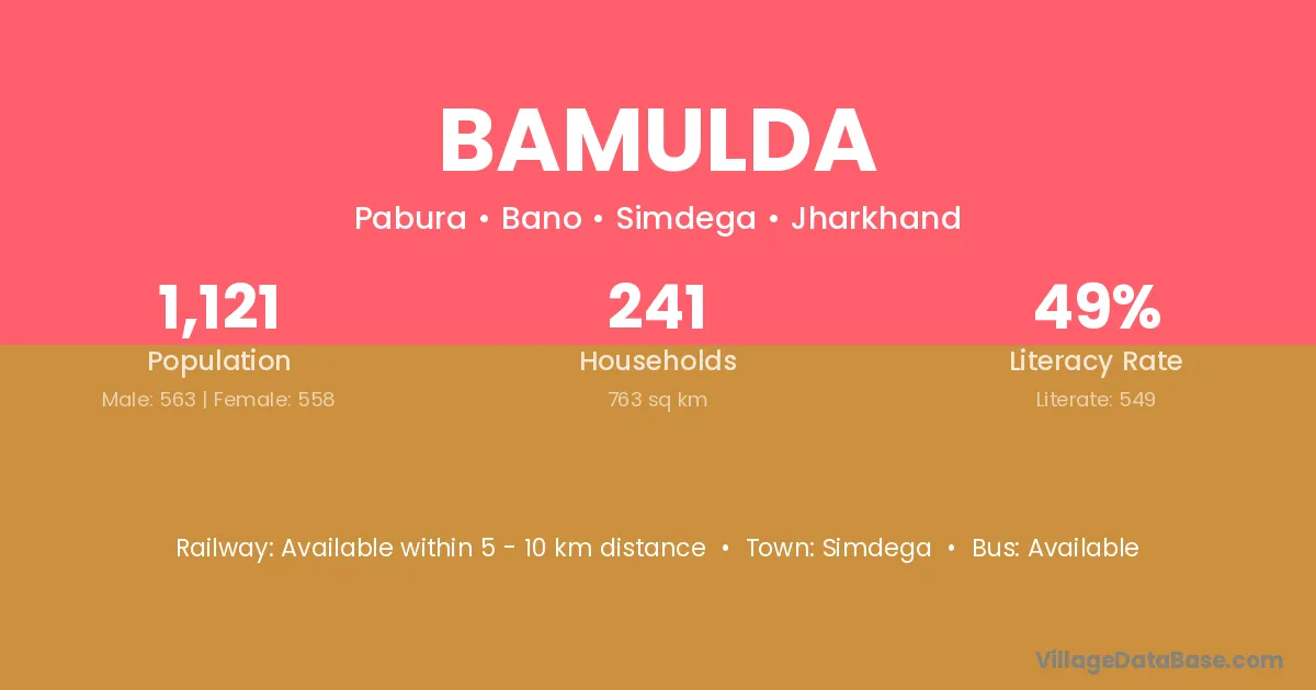 Bamulda village has a total population of 1,121 people, of which 563 are males and 558 are females.