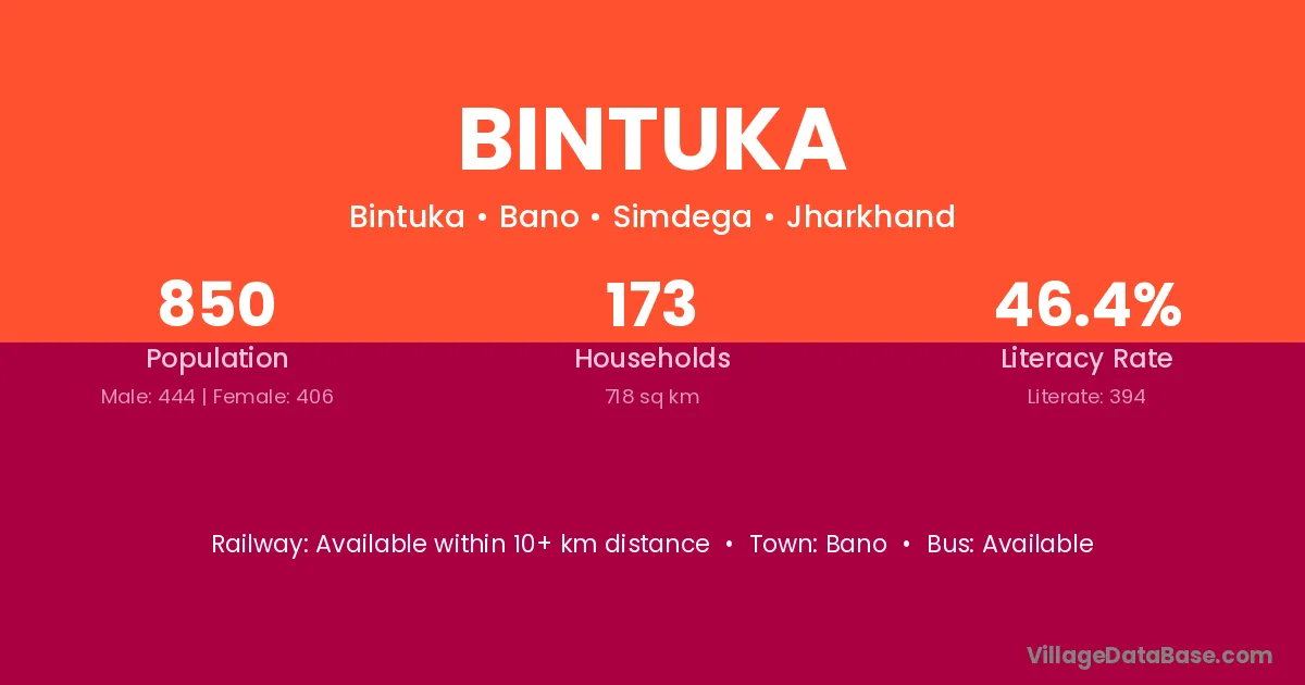Bintuka village has a total population of 850 people, of which 444 are males and 406 are females.