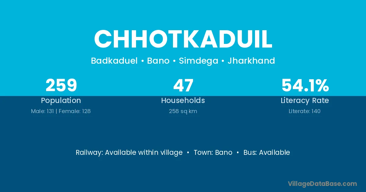 Chhotkaduil village has a total population of 259 people, of which 131 are males and 128 are females.