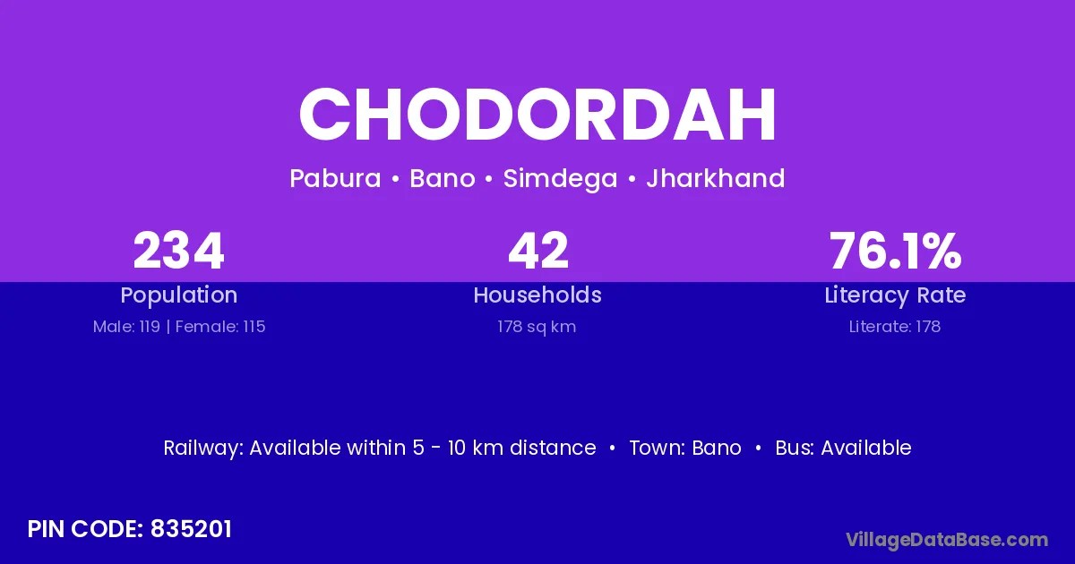 Chodordah village is located in the Bano Subdivision of the Simdega district in Jharkhand .