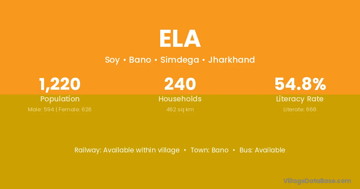 Ela village has a total population of 1,220 people, of which 594 are males and 626 are females.