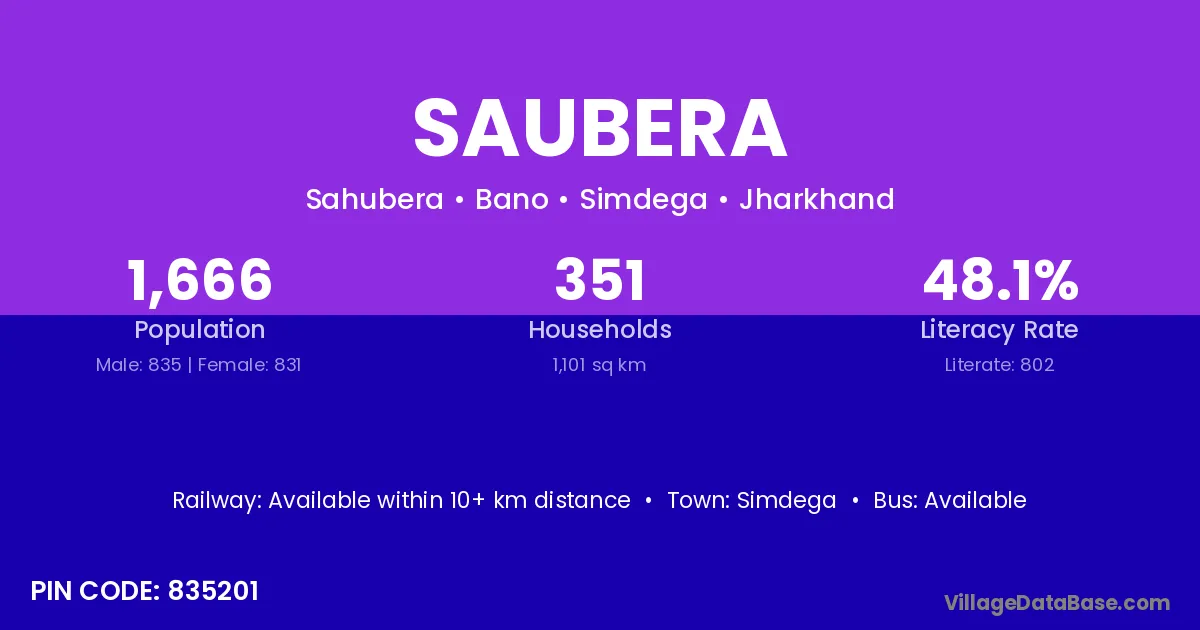 Saubera village has a total population of 1,666 people, of which 835 are males and 831 are females.
