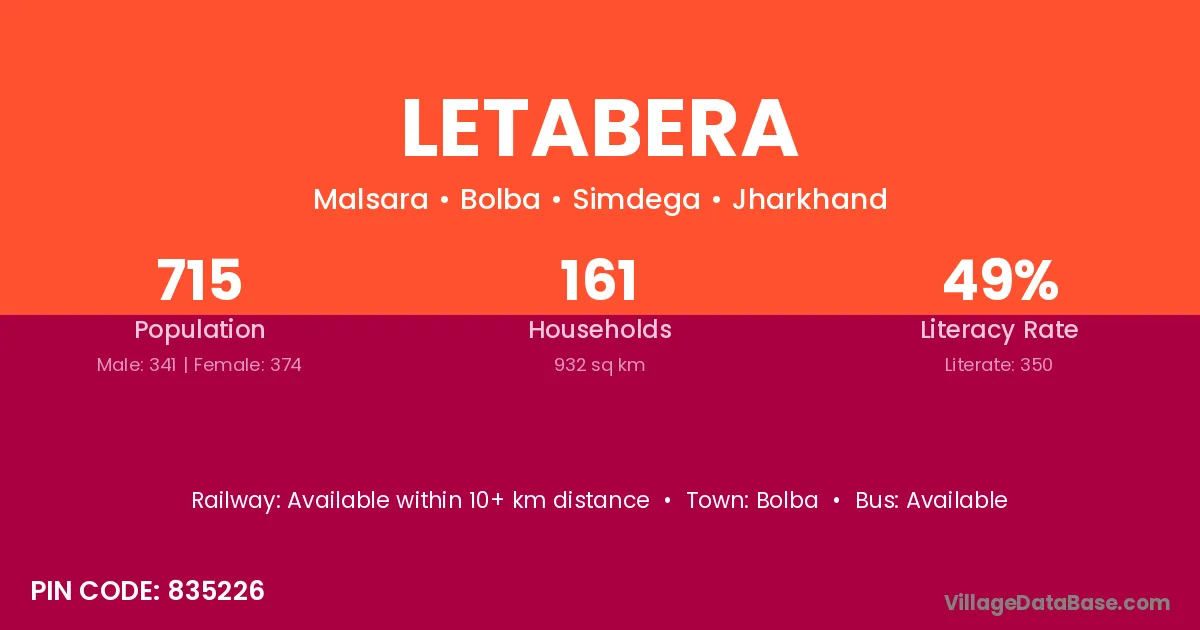 Letabera village has a total population of 715 people, of which 341 are males and 374 are females.