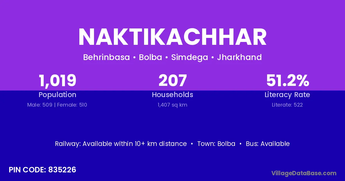 Naktikachhar village has a total population of 1,019 people, of which 509 are males and 510 are females.