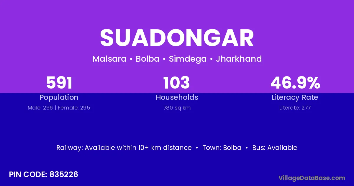 Suadongar village has a total population of 591 people, of which 296 are males and 295 are females.