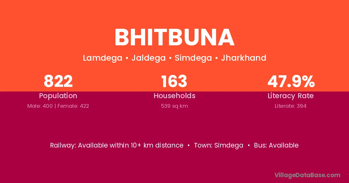 Bhitbuna village has a total population of 822 people, of which 400 are males and 422 are females.
