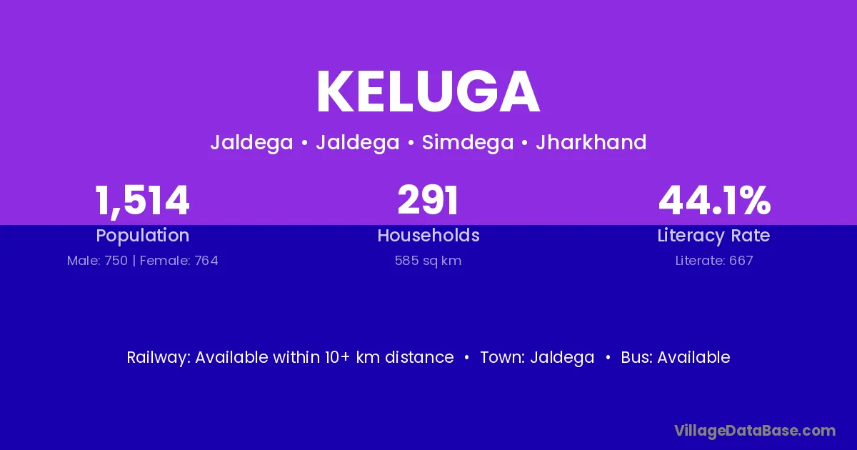 Keluga village has a total population of 1,514 people, of which 750 are males and 764 are females.