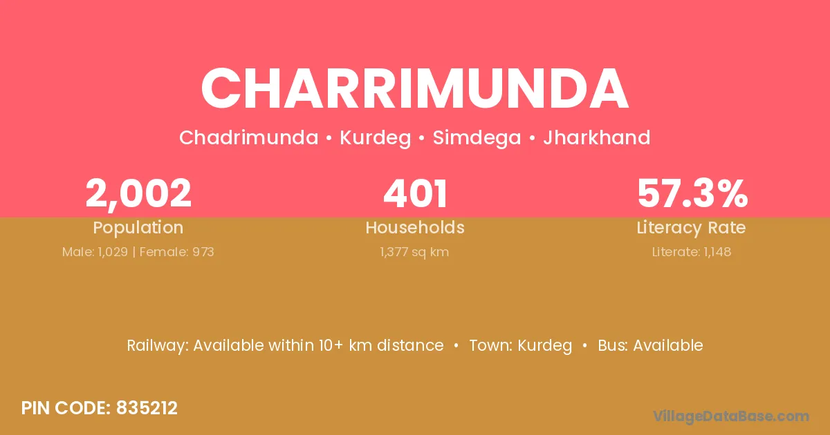 Charrimunda village has a total population of 2,002 people, of which 1,029 are males and 973 are females.
