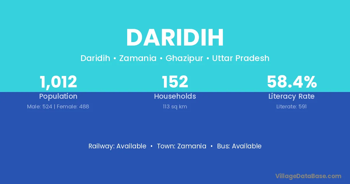 The literacy rate of Daridih village is 57.58%. Male literacy stands at 67.61% and female literacy at 48.28%.