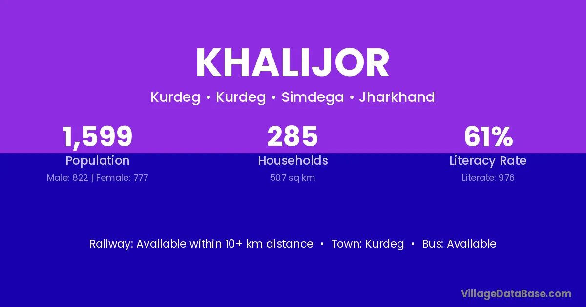 Khalijor village has a total population of 1,599 people, of which 822 are males and 777 are females.