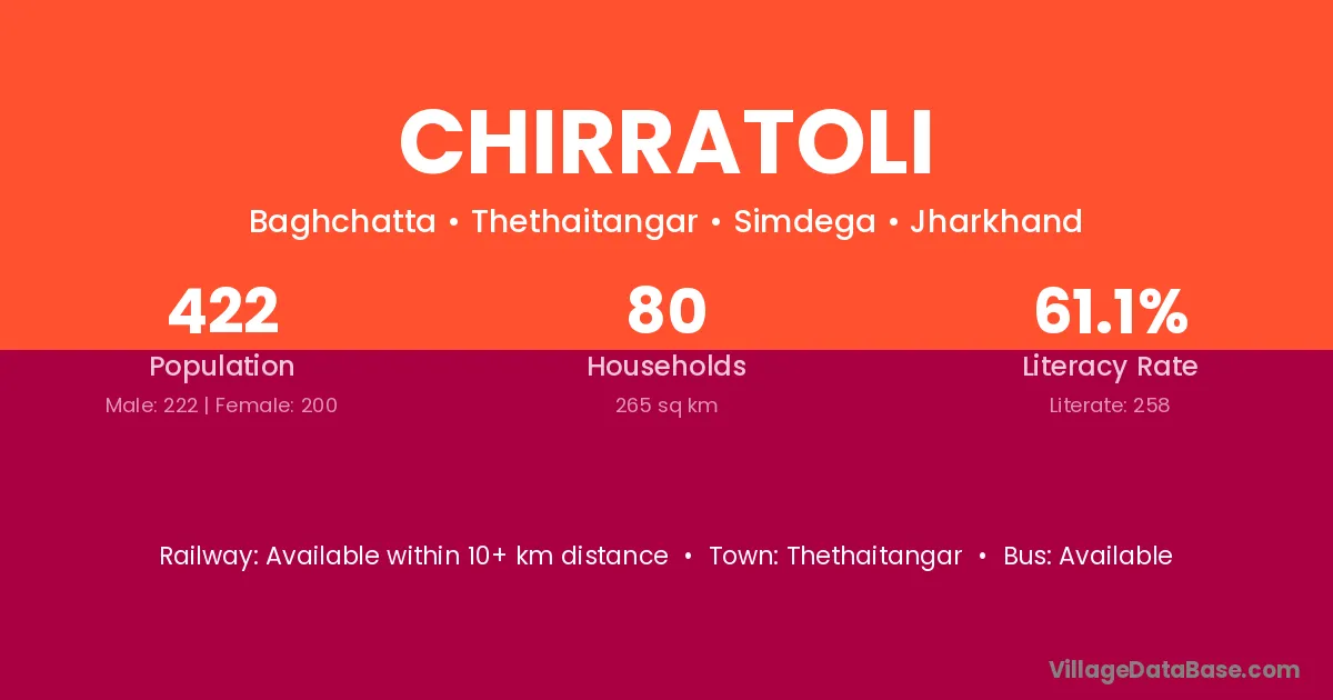Chirratoli village has a total population of 422 people, of which 222 are males and 200 are females.