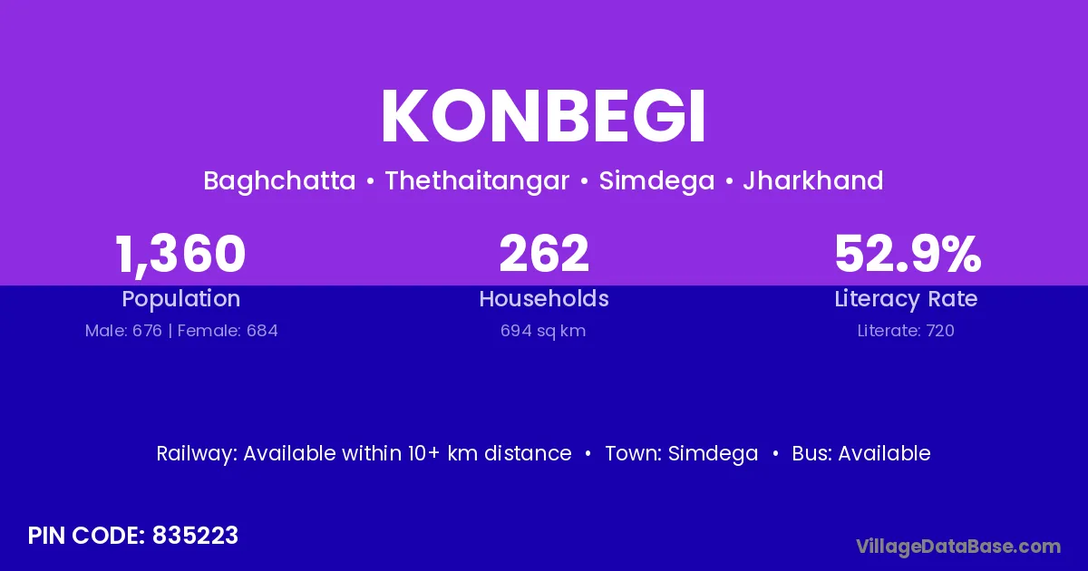 The literacy rate of Konbegi village is 52.94%. Male literacy stands at 59.76% and female literacy at 46.20%.