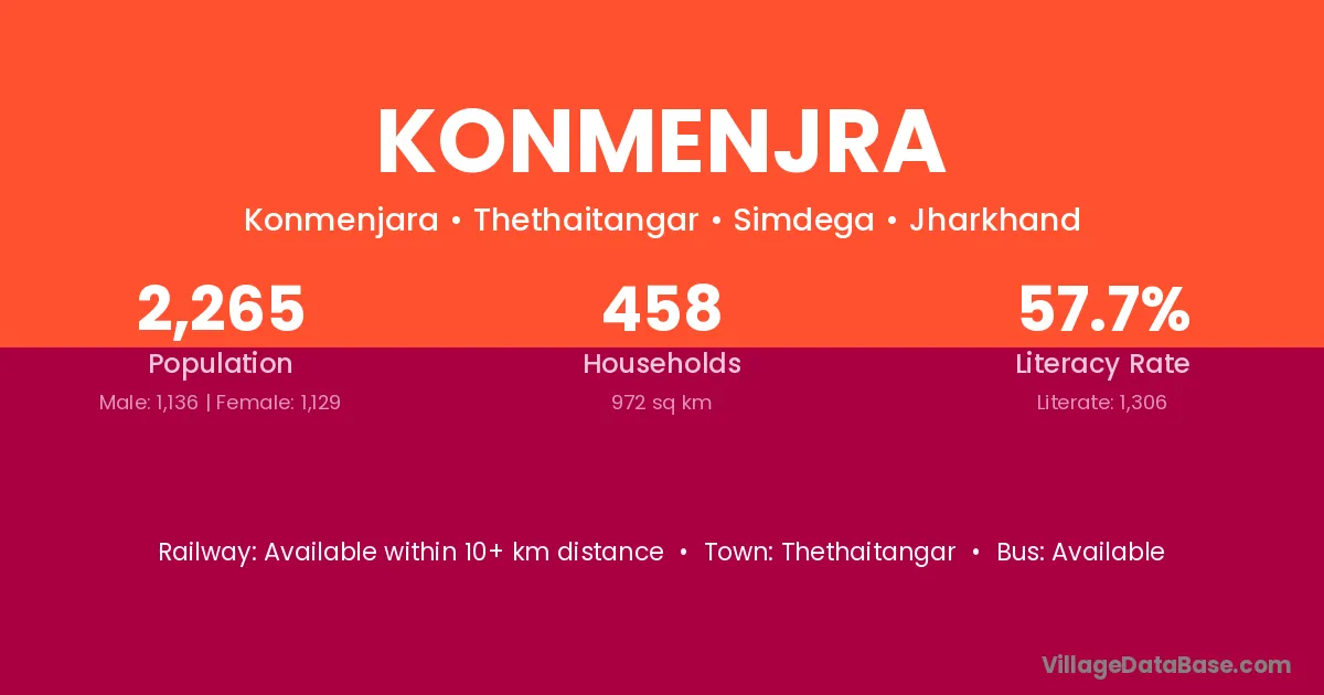 Konmenjra village has a total population of 2,265 people, of which 1,136 are males and 1,129 are females.