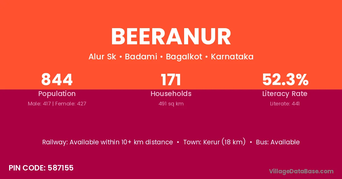 Kerur (18 km) is the nearest town to Beeranur village for major economic activities and is located approximately 18 km away.