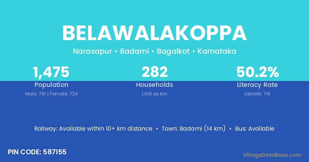 Badami (14 km) is the nearest town to Belawalakoppa village for major economic activities and is located approximately 14 km away.