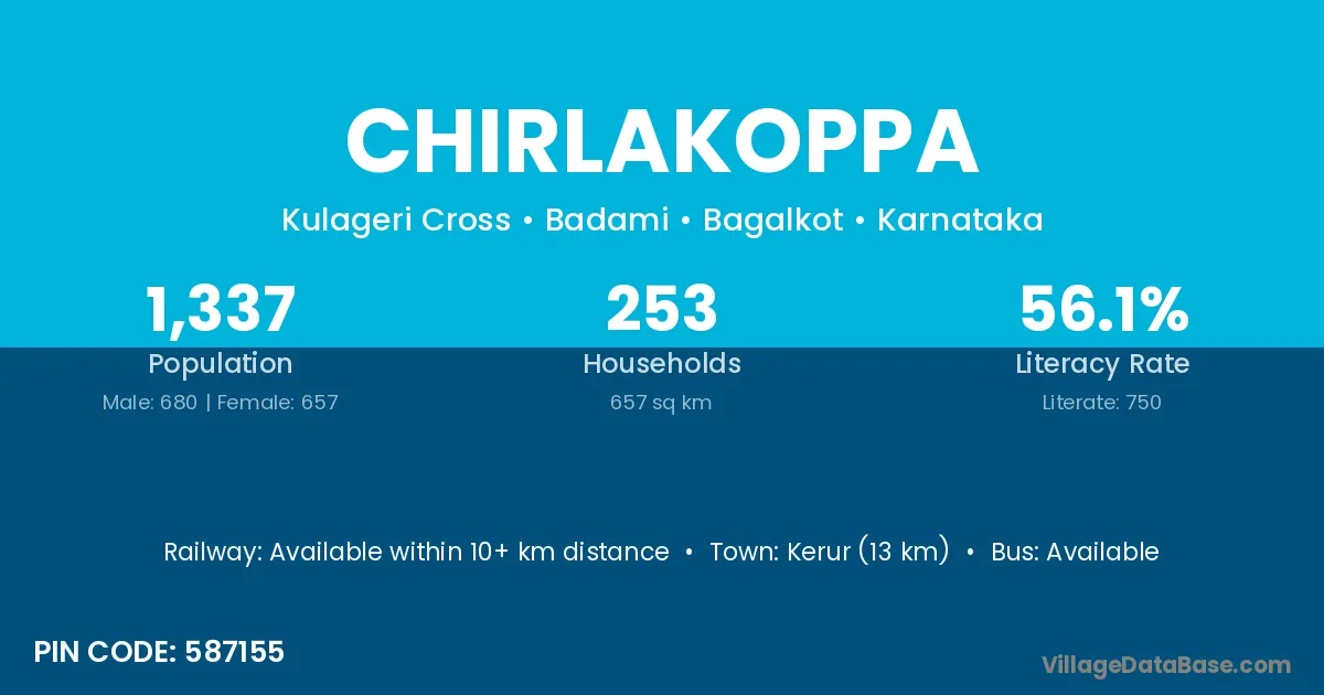 Kerur (13 km) is the nearest town to Chirlakoppa village for major economic activities and is located approximately 13 km away.