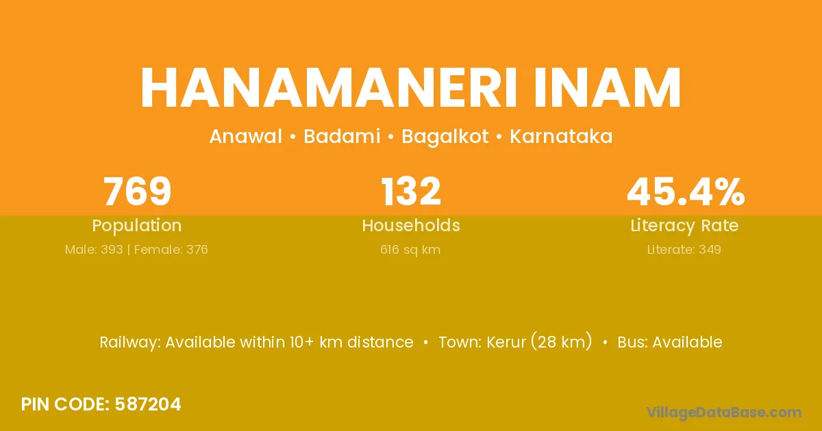 Hanamaneri Inam village has a total population of 769 people, of which 393 are males and 376 are females.