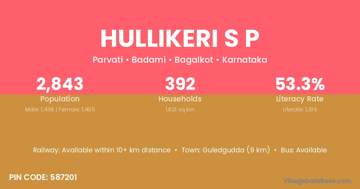 Hullikeri S P village has a total population of 2,843 people, of which 1,438 are males and 1,405 are females.