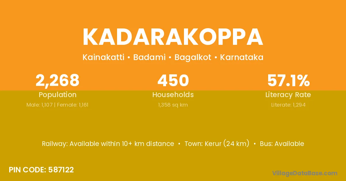 Kerur (24 km) is the nearest town to Kadarakoppa village for major economic activities and is located approximately 24 km away.