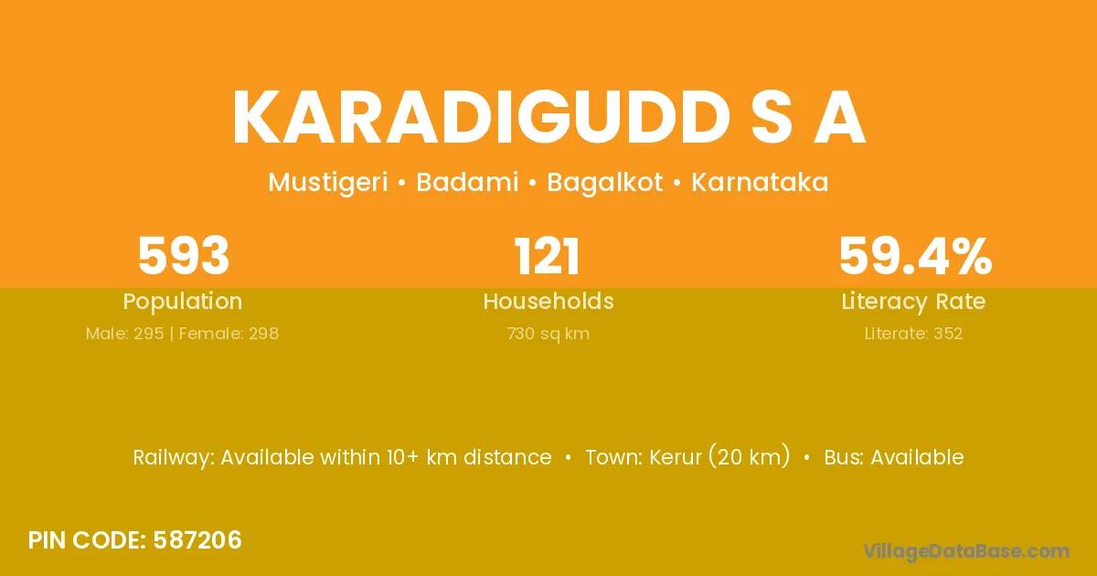 Karadigudd S A village has a total population of 593 people, of which 295 are males and 298 are females.
