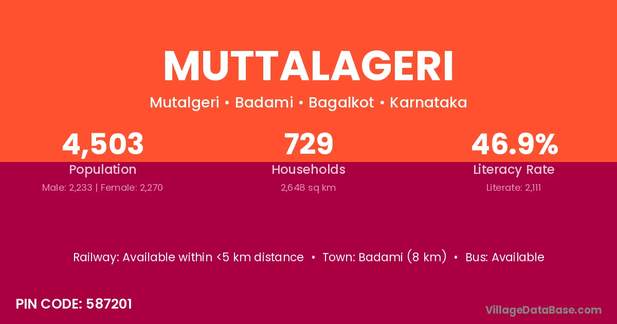 Badami (8 km) is the nearest town to Muttalageri village for major economic activities and is located approximately 8 km away.