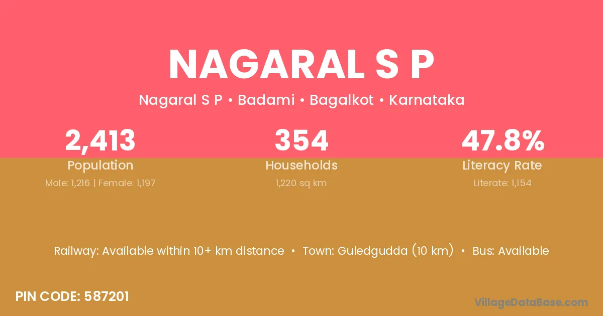 Nagaral S P village has a total population of 2,413 people, of which 1,216 are males and 1,197 are females.