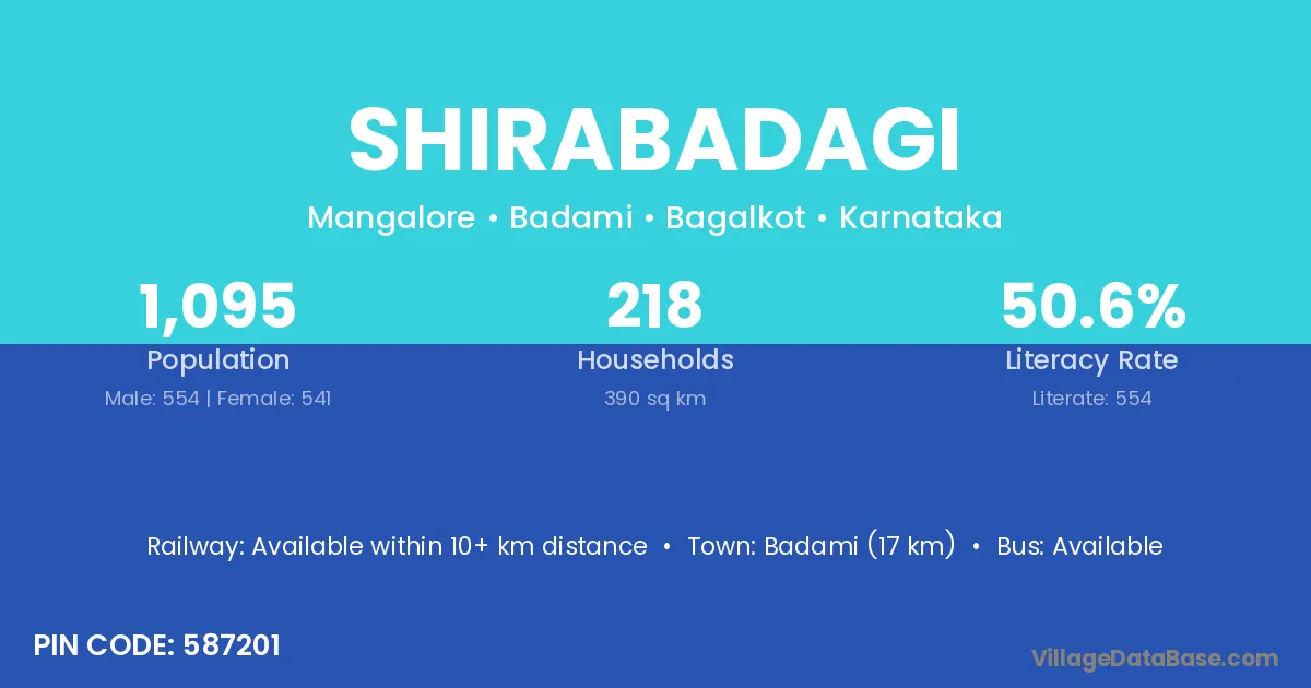 Badami (17 km) is the nearest town to Shirabadagi village for major economic activities and is located approximately 17 km away.