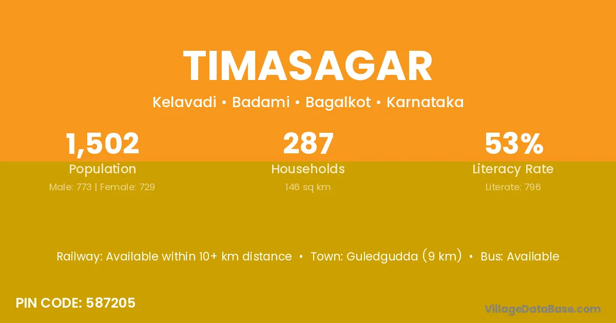 Guledgudda (9 km) is the nearest town to Timasagar village for major economic activities and is located approximately 9 km away.