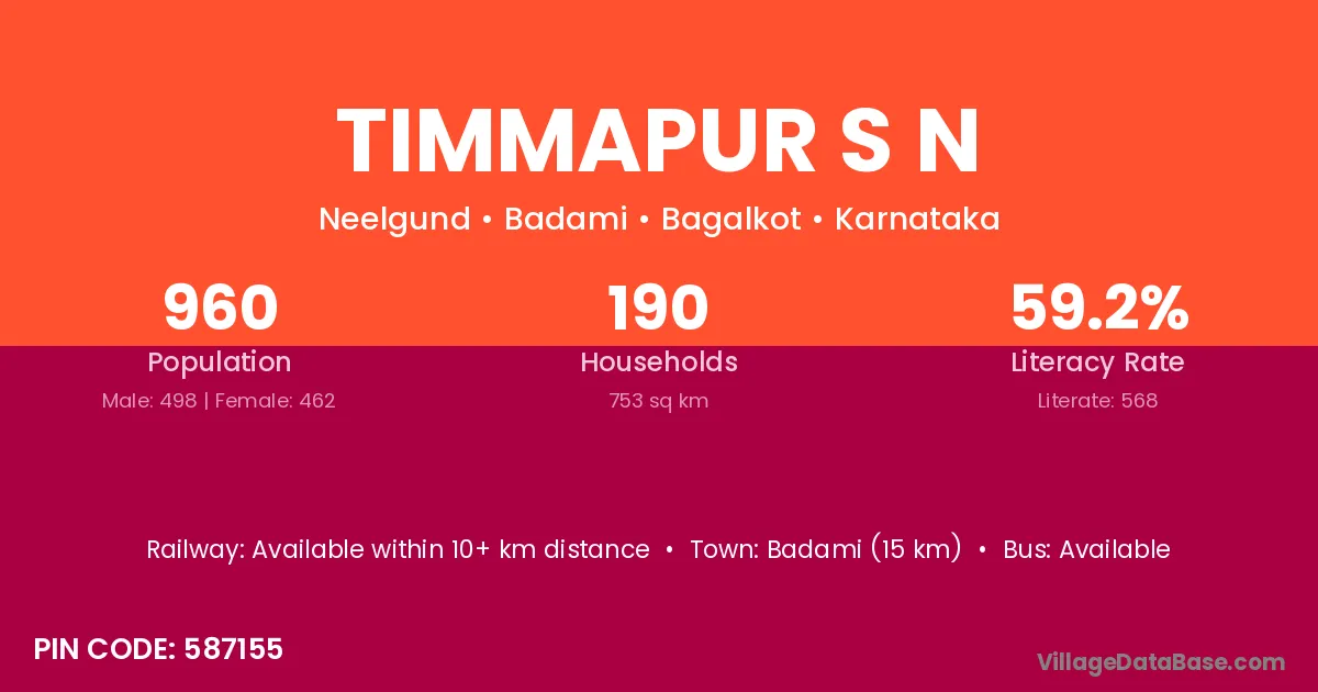 Timmapur S N village has a total population of 960 people, of which 498 are males and 462 are females.