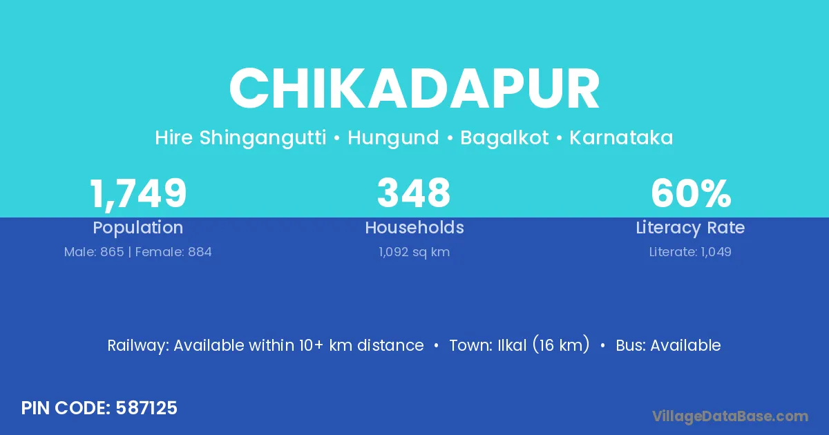 Ilkal (16 km) is the nearest town to Chikadapur village for major economic activities and is located approximately 16 km away.