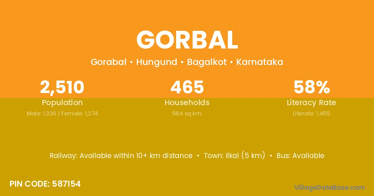 Ilkal (5 km) is the nearest town to Gorbal village for major economic activities and is located approximately 5 km away.