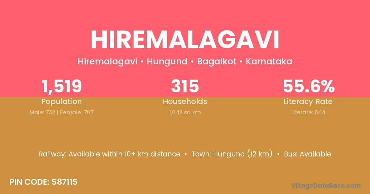 Hungund (12 km) is the nearest town to Hiremalagavi village for major economic activities and is located approximately 12 km away.