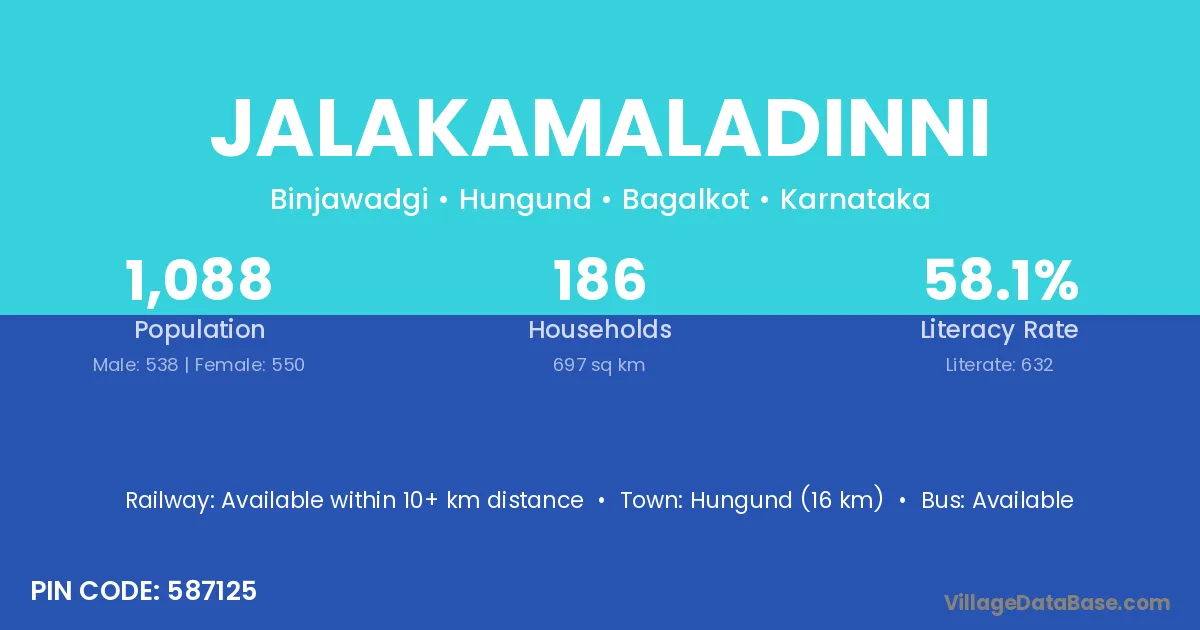 Hungund (16 km) is the nearest town to Jalakamaladinni village for major economic activities and is located approximately 16 km away.