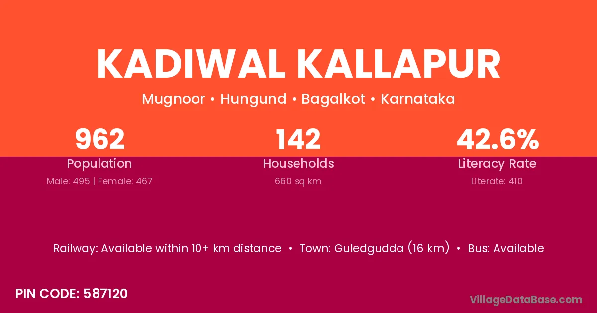 Guledgudda (16 km) is the nearest town to Kadiwal Kallapur village for major economic activities and is located approximately 16 km away.