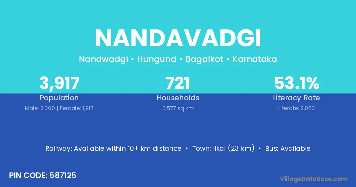 Ilkal (23 km) is the nearest town to Nandavadgi village for major economic activities and is located approximately 23 km away.