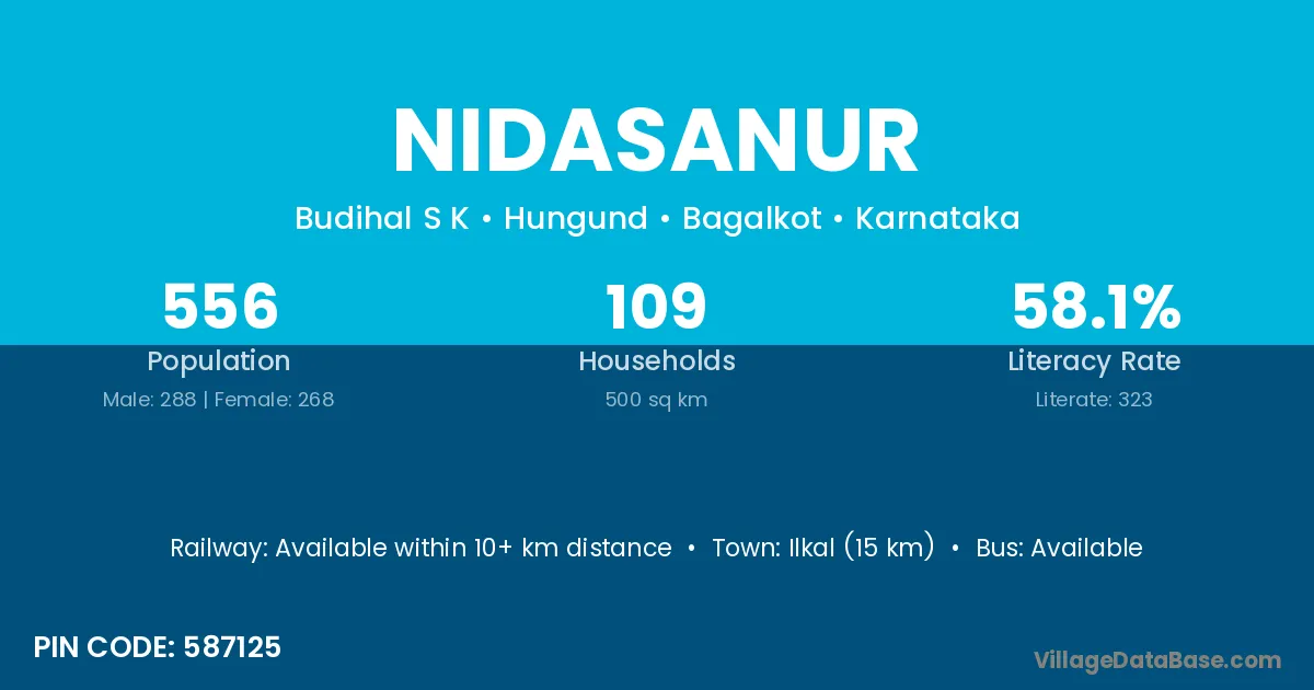 Ilkal (15 km) is the nearest town to Nidasanur village for major economic activities and is located approximately 15 km away.