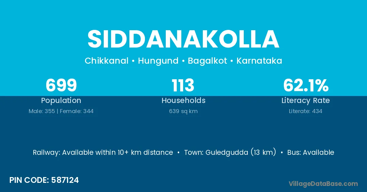 Guledgudda (13 km) is the nearest town to Siddanakolla village for major economic activities and is located approximately 13 km away.