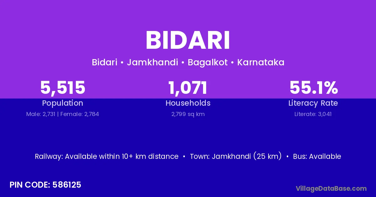 Jamkhandi (25 km) is the nearest town to Bidari village for major economic activities and is located approximately 25 km away.