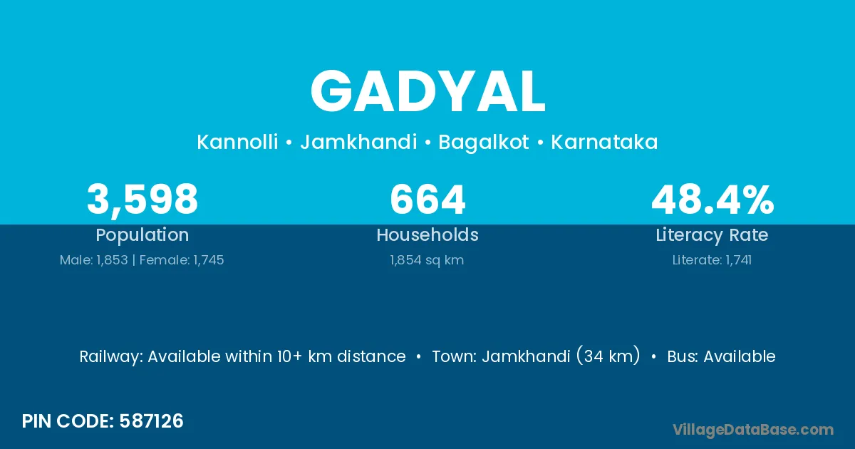 Jamkhandi (34 km) is the nearest town to Gadyal village for major economic activities and is located approximately 34 km away.