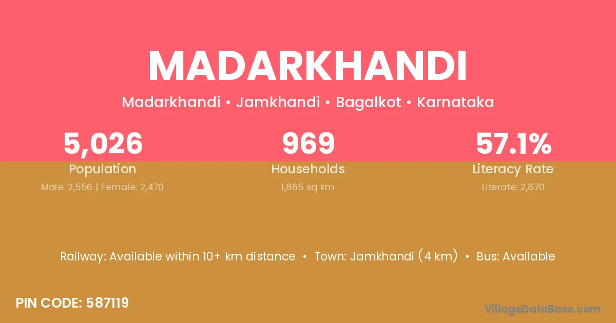 Jamkhandi (4 km) is the nearest town to Madarkhandi village for major economic activities and is located approximately 4 km away.