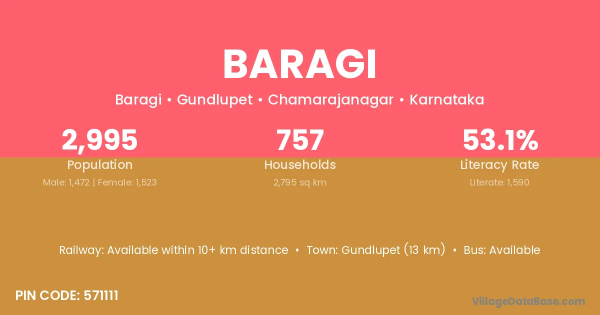 Mudhol (10 km) is the nearest town to Baragi village for major economic activities and is located approximately 10 km away.