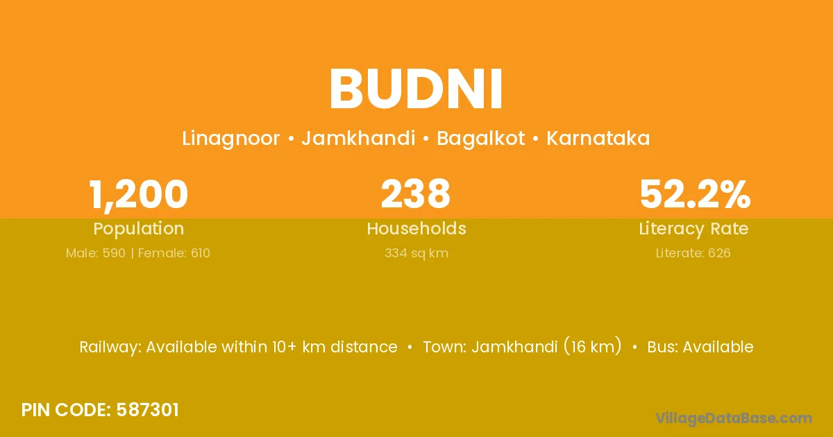 Mahalingpur (1 km) is the nearest town to Budni village for major economic activities and is located approximately 1 km away.