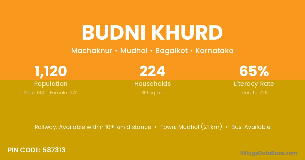 Mudhol (21 km) is the nearest town to Budni Khurd village for major economic activities and is located approximately 21 km away.