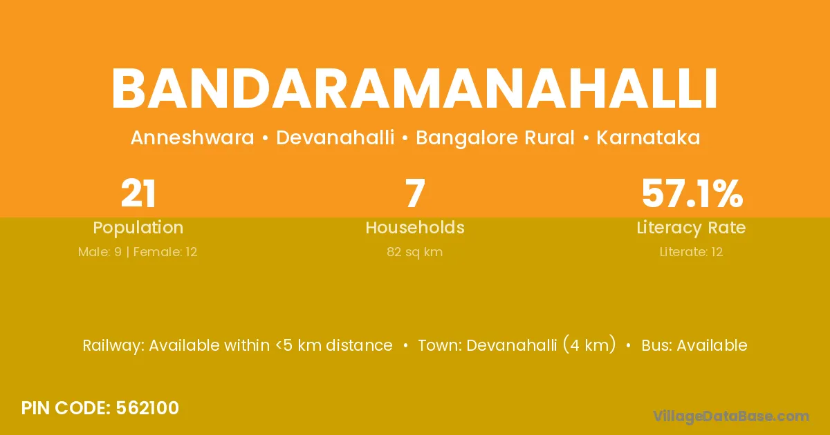 Bandaramanahalli village has a total population of 21 people, of which 9 are males and 12 are females.